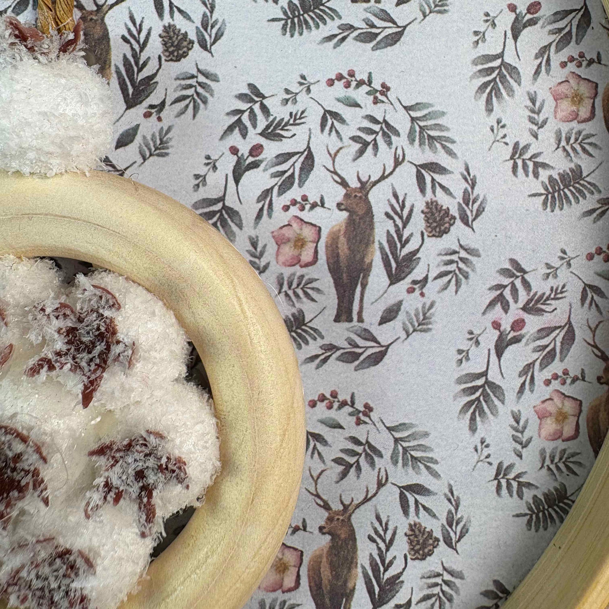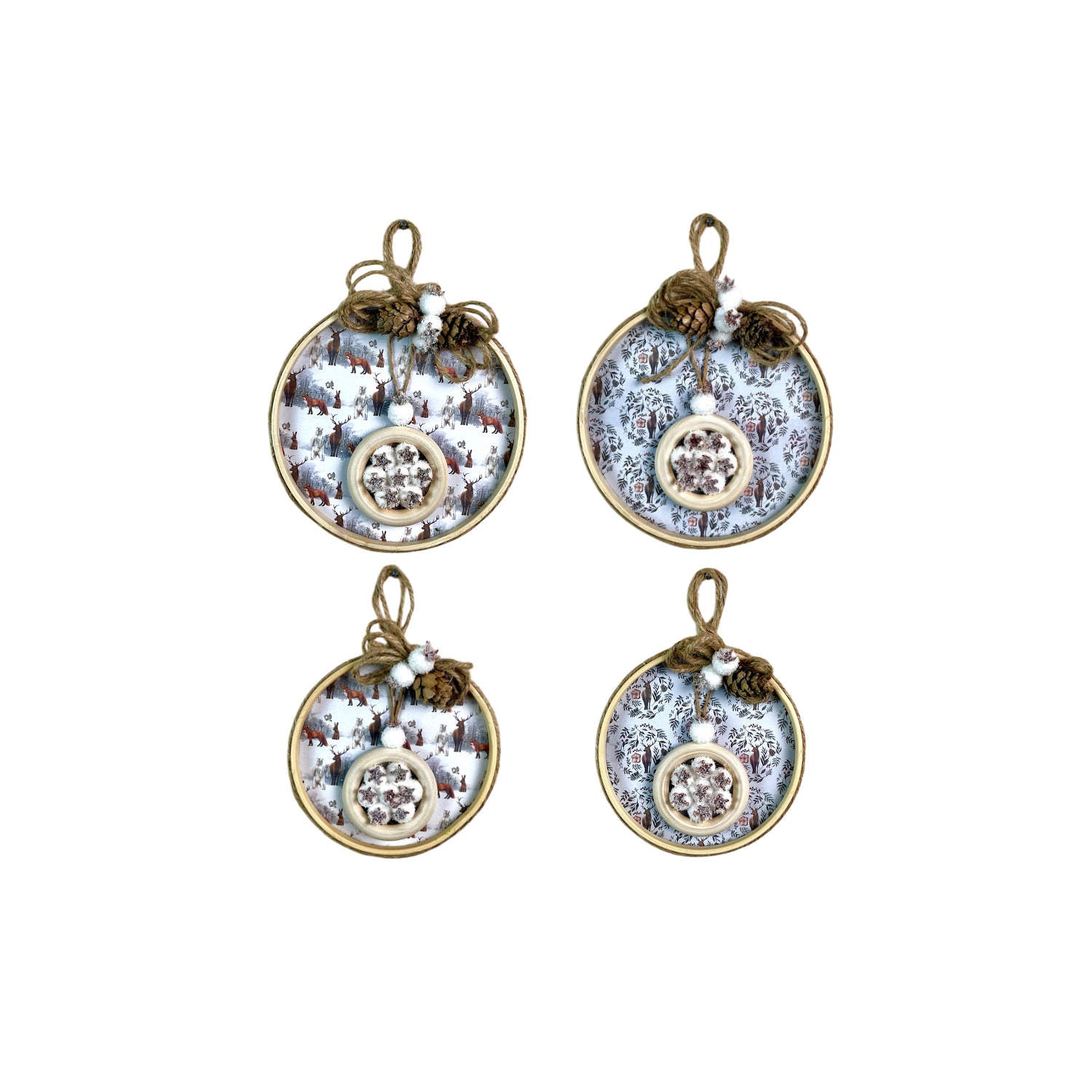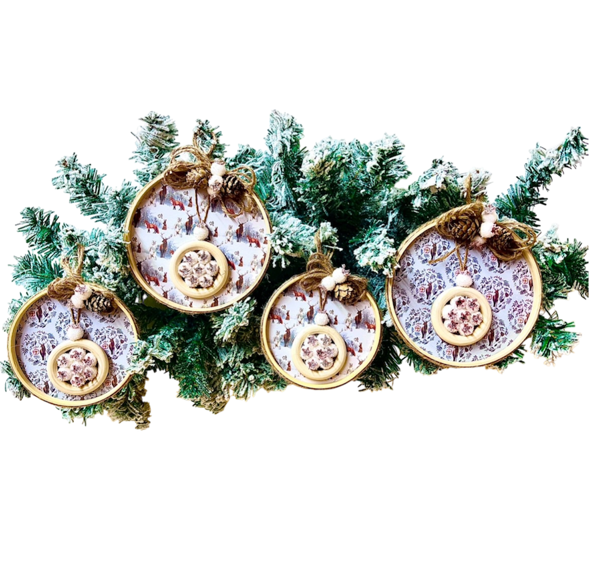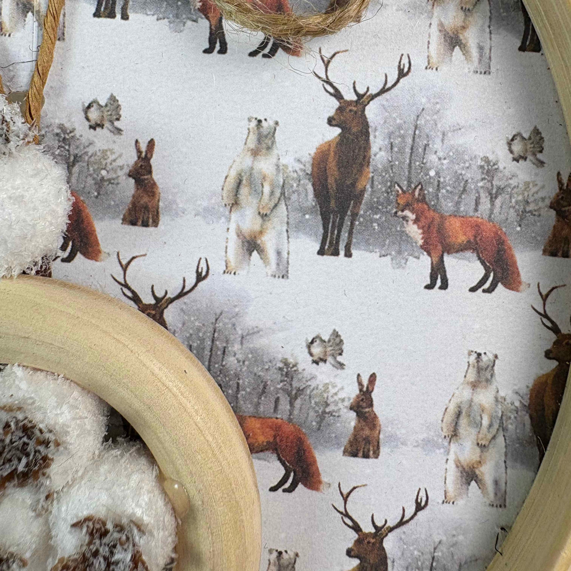 Serie di 4 telaietti, 2 da 13 cm e 2 da 15 cm di diametro, realizzati con carte fantasia animali invernali, un anello di legno centrale e bacche bianche. Ideali come decorazioni sull' albero di Natale.