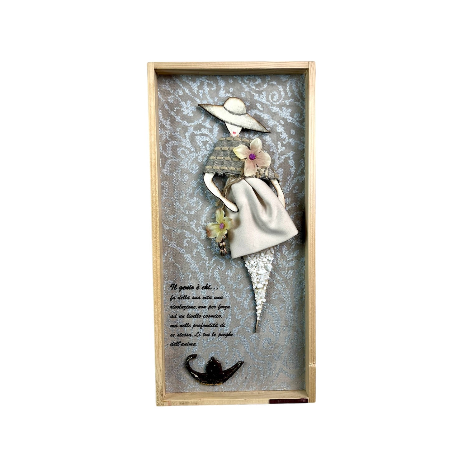 Le nostre geniette sono realizzate su base di legno di abete ricoperta di carta da parato di recupero. Gli abitini sono confezionati con tessuti di pregio riciclati e tanti piccoli accessori di scarto, motivo per cui ogni creazione è unica ed originale. Scegli quella che fa per te emozionandoti con le frasi dedicate. Le misure sono 17×35 cm e sarà confezionata in una scatola di cartone riciclato.