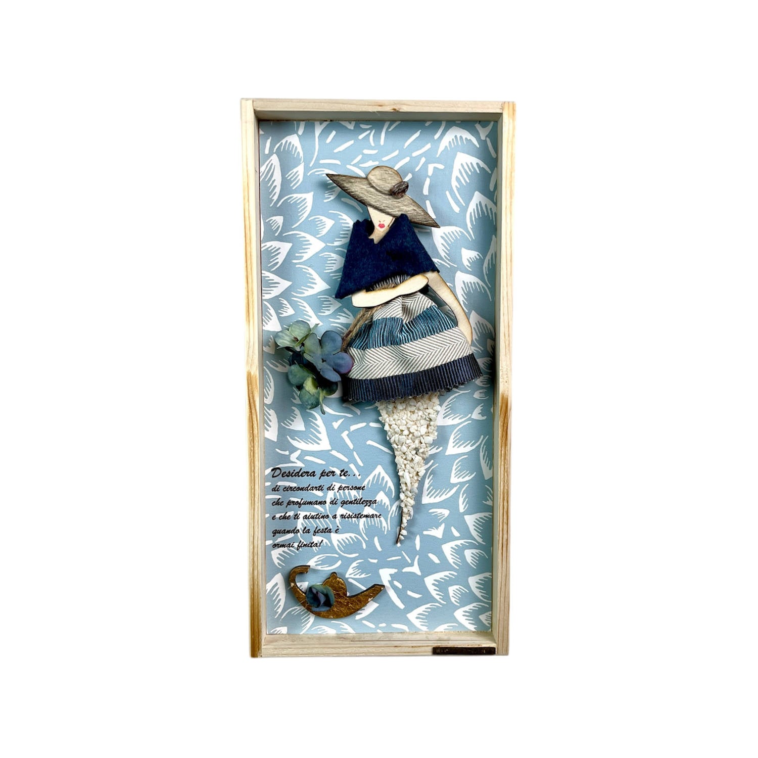 Le nostre geniette sono realizzate su base di legno di abete ricoperta di carta da parato di recupero. Gli abitini sono confezionati con tessuti di pregio riciclati e tanti piccoli accessori di scarto, motivo per cui ogni creazione è unica ed originale. Scegli quella che fa per te emozionandoti con le frasi dedicate. Le misure sono 17×35 cm e sarà confezionata in una scatola di cartone riciclato.