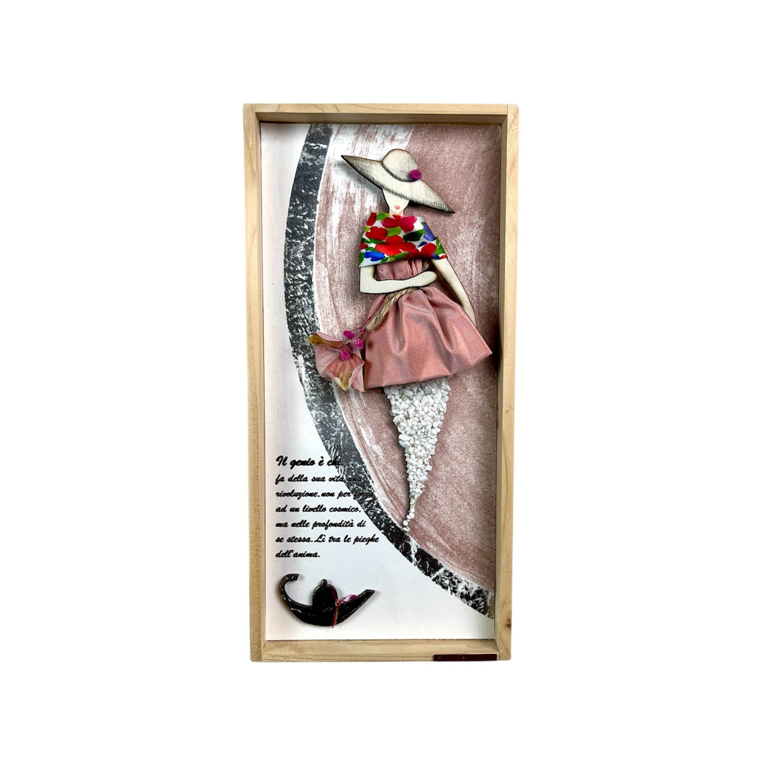 Le nostre geniette sono realizzate su base di legno di abete ricoperta di carta da parato di recupero. Gli abitini sono confezionati con tessuti di pregio riciclati e tanti piccoli accessori di scarto, motivo per cui ogni creazione è unica ed originale. Scegli quella che fa per te emozionandoti con le frasi dedicate. Le misure sono 17×35 cm e sarà confezionata in una scatola di cartone riciclato.