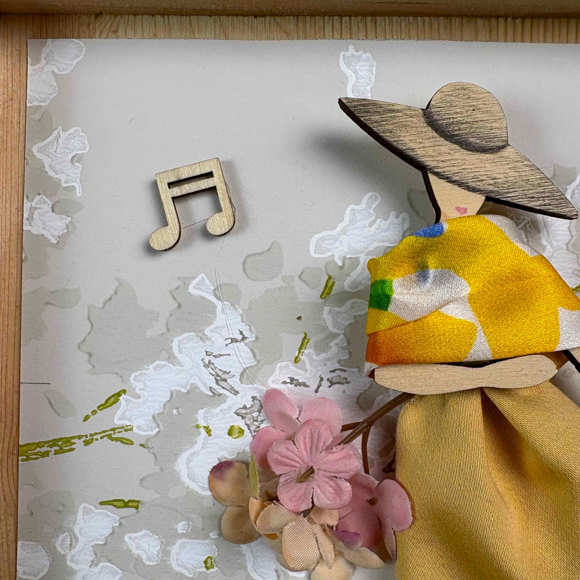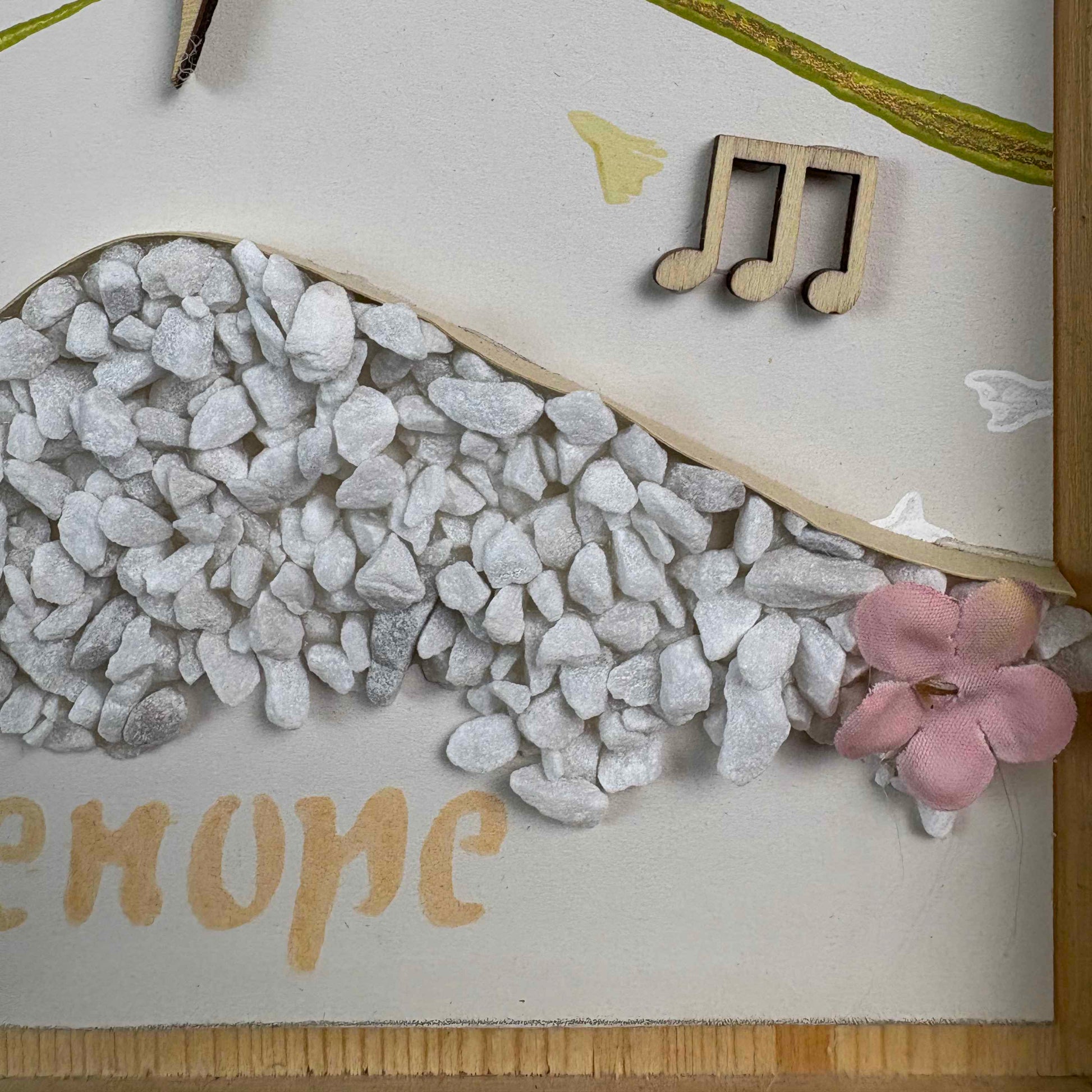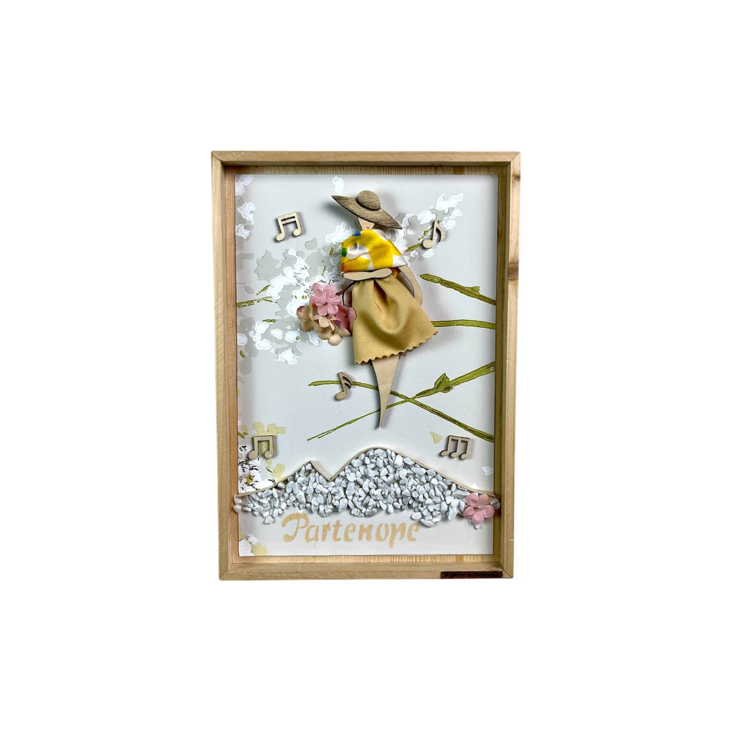 Tutti i lavori Made in Naples, sono realizzati su base di legno di abete utilizzando carte, tessuti e accessori di riciclo. I soggetti rappresentati, sono realizzati con lapillo vulcanico raccolto in terreni limitrofi al Parco Nazionale del Vesuvio. Misure