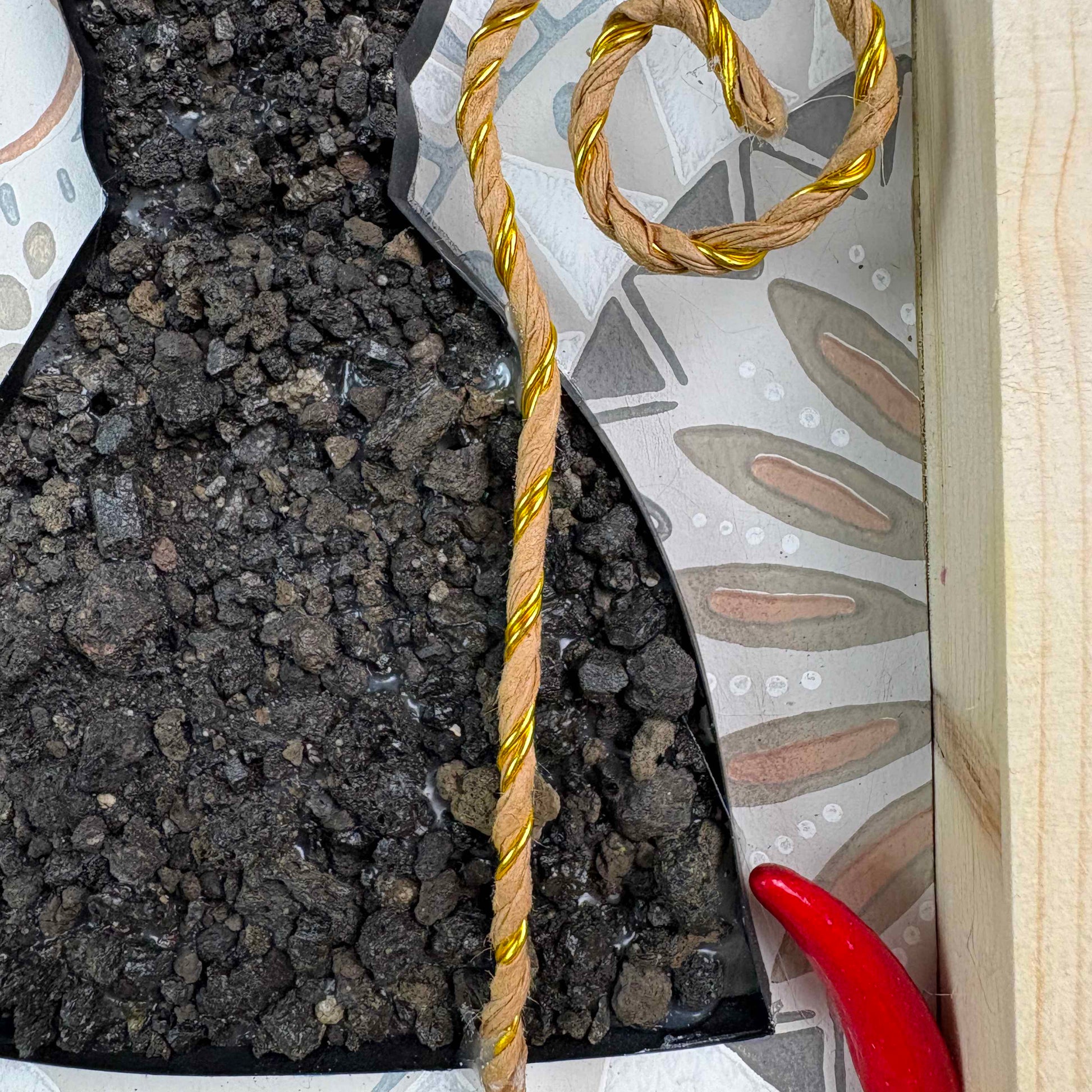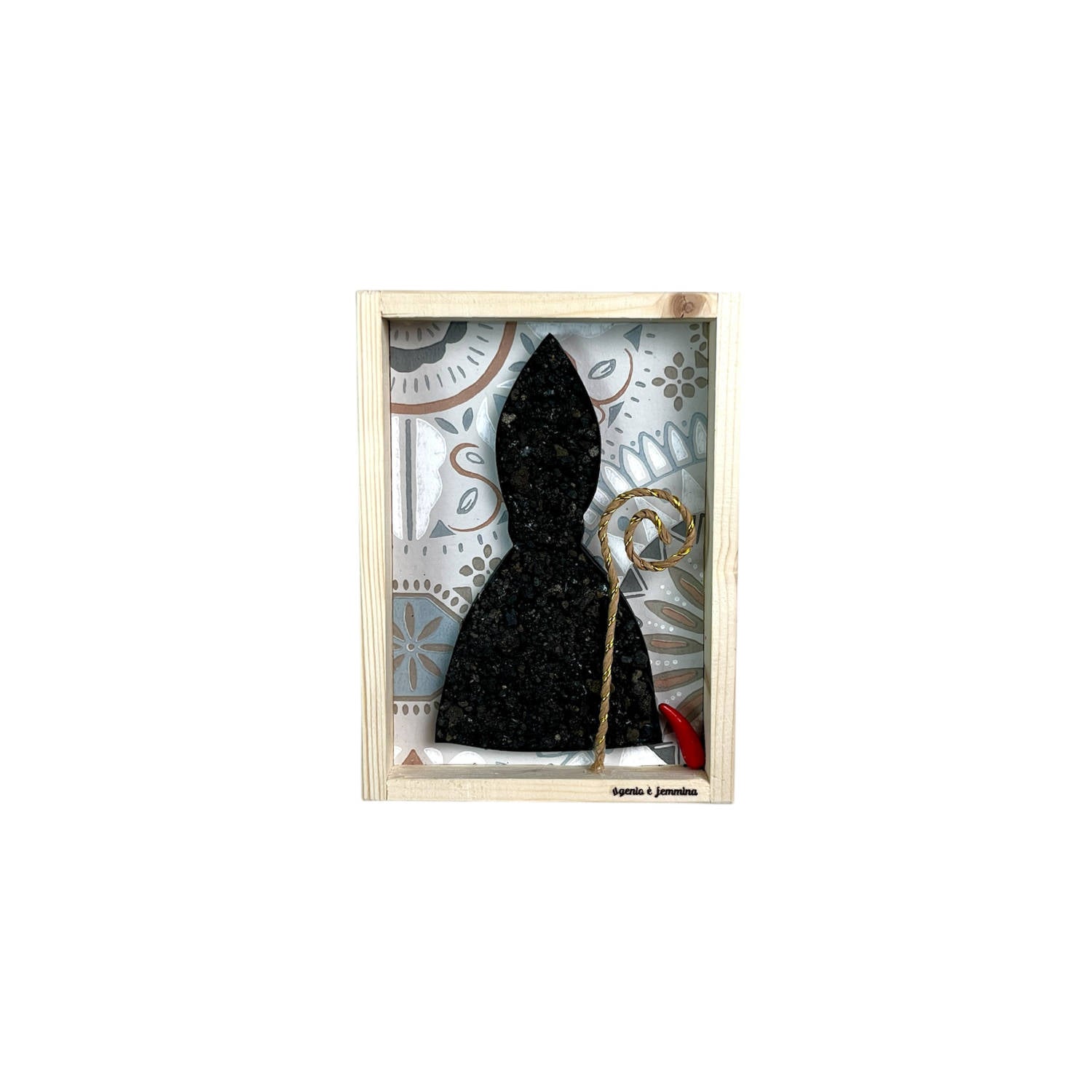 Tutti i lavori Made in Naples, sono realizzati su base di legno di abete utilizzando carte, tessuti e accessori di riciclo. I soggetti rappresentati, sono realizzati con lapillo vulcanico raccolto in terreni limitrofi al Parco Nazionale del Vesuvio. Misure 14x19 cm, scatola inclusa.