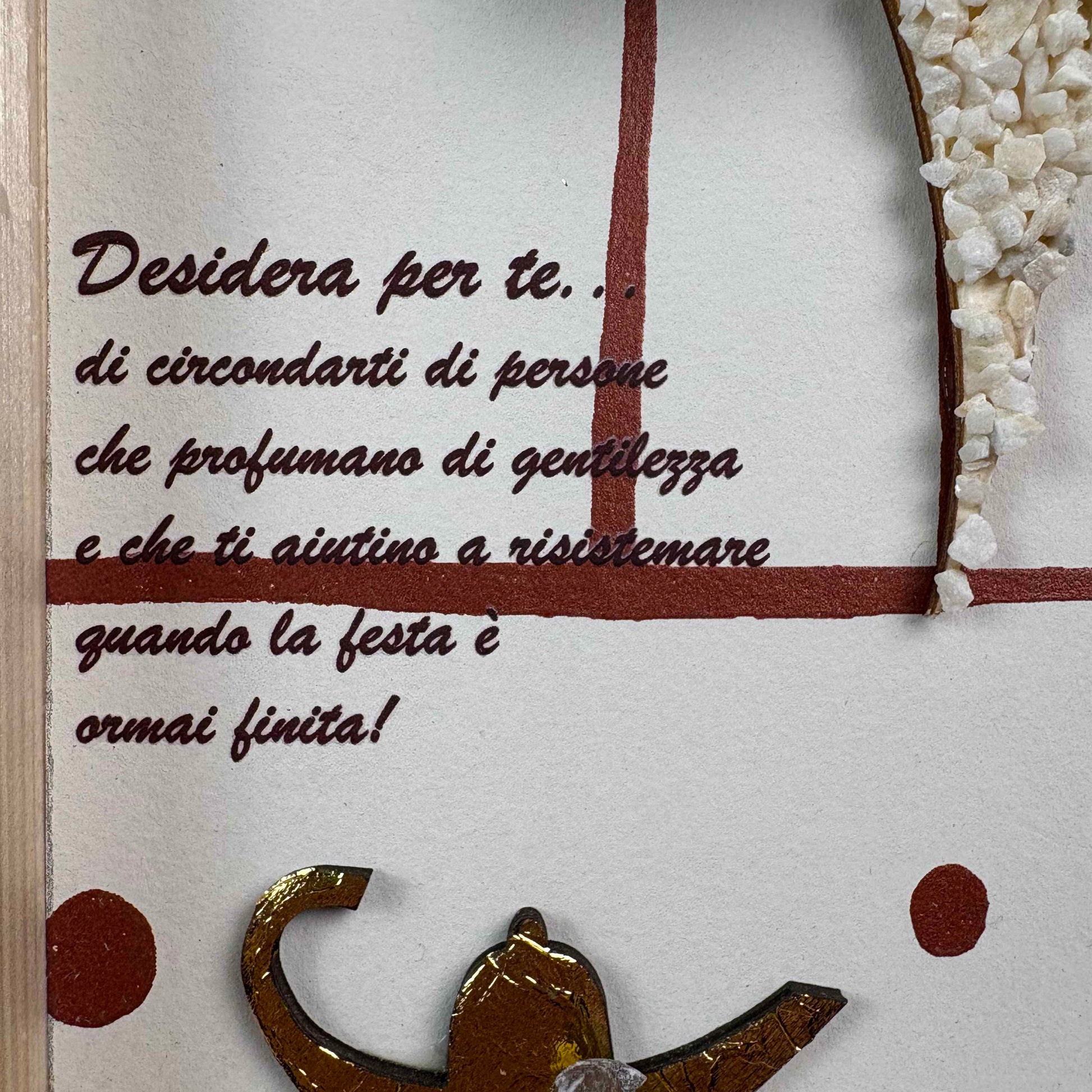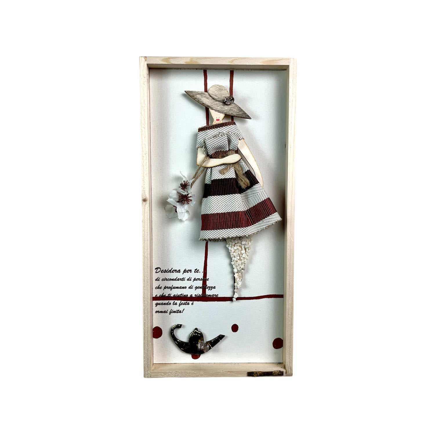 Le nostre geniette sono realizzate su base di legno di abete ricoperta di carta da parato di recupero. Gli abitini sono confezionati con tessuti di pregio riciclati e tanti piccoli accessori di scarto, motivo per cui ogni creazione è unica ed originale. Scegli quella che fa per te emozionandoti con le frasi dedicate. Le misure sono 17×35 cm e sarà confezionata in una scatola di cartone riciclato.