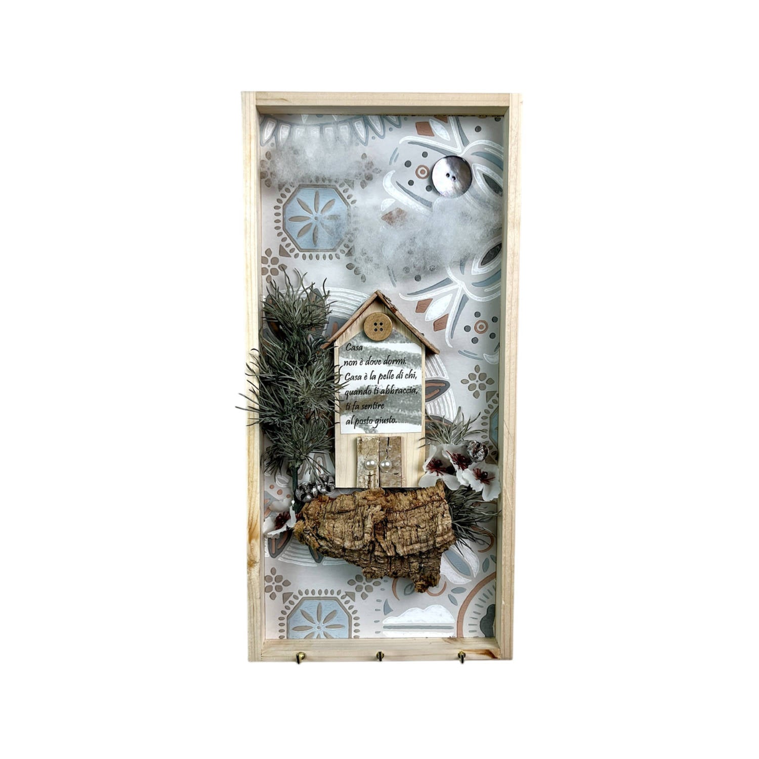 Appendichiavi realizzato su base di legno di abete, carte da parati pregiate di riciclo, tre appendini e tanti dettagli che invogliano a tornare sempre a casa. Misure 17x33 cm, scatola inclusa.