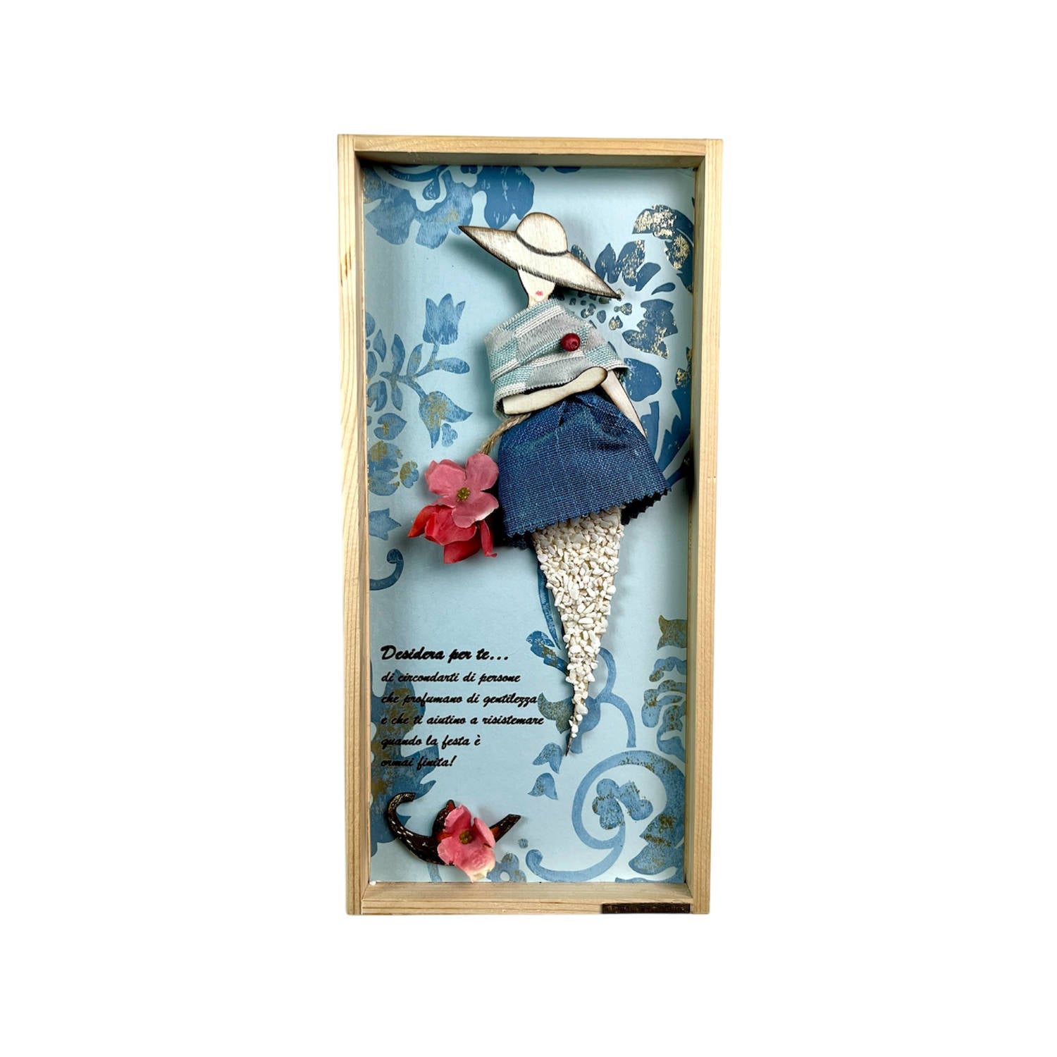 Le nostre geniette sono realizzate su base di legno di abete ricoperta di carta da parato di recupero. Gli abitini sono confezionati con tessuti di pregio riciclati e tanti piccoli accessori di scarto, motivo per cui ogni creazione è unica ed originale. Scegli quella che fa per te emozionandoti con le frasi dedicate. Le misure sono 17×35 cm e sarà confezionata in una scatola di cartone riciclato.