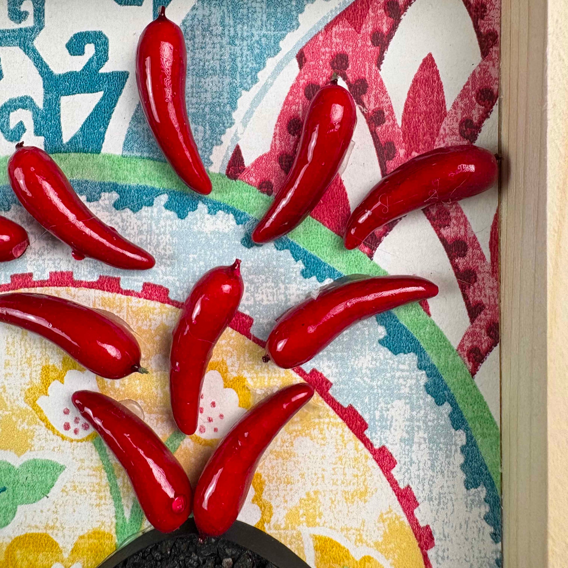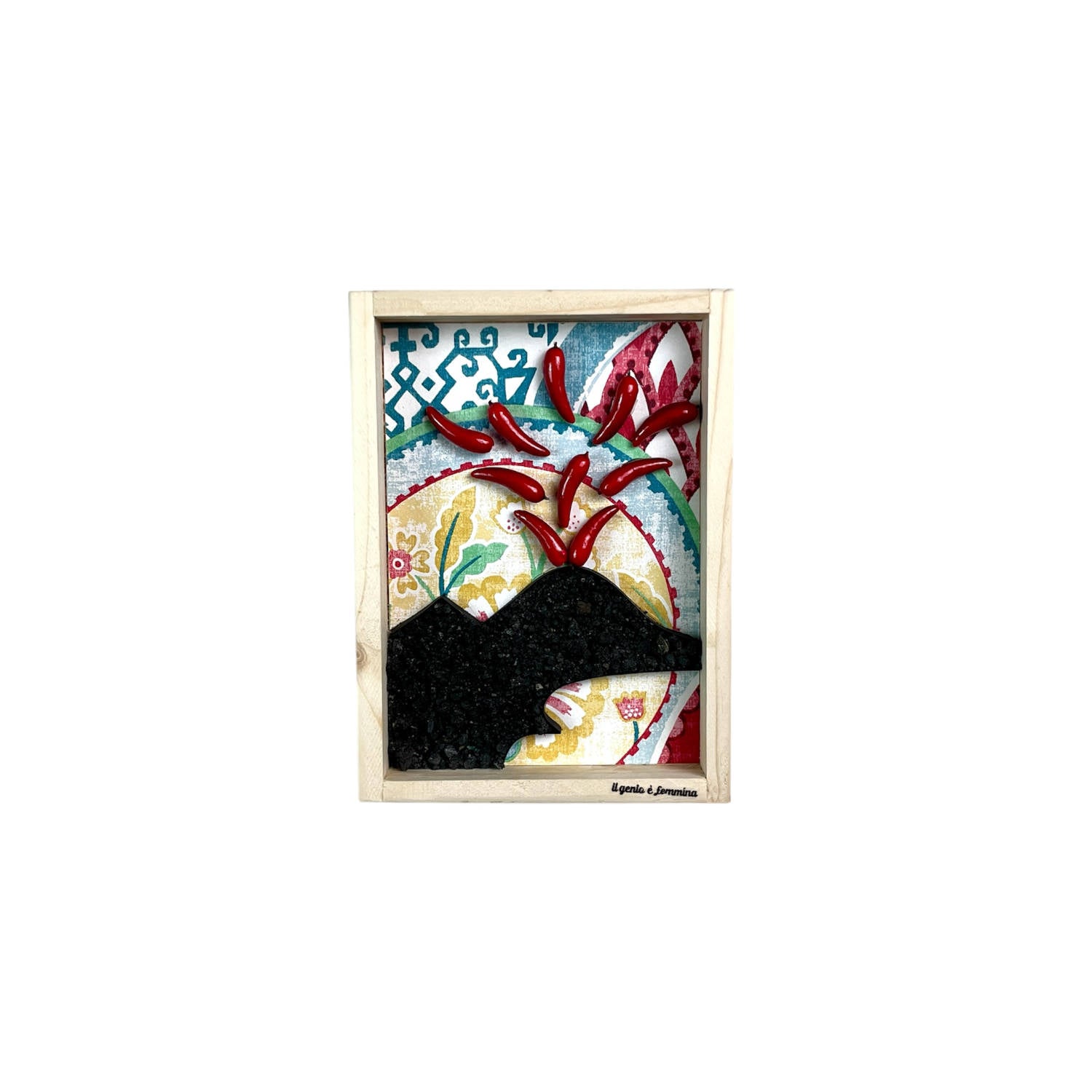 Tutti i lavori Made in Naples, sono realizzati su base di legno di abete utilizzando carte, tessuti e accessori di riciclo. I soggetti rappresentati, sono realizzati con lapillo vulcanico raccolto in terreni limitrofi al Parco Nazionale del Vesuvio. Misure 14x19cm, scatola inclusa.