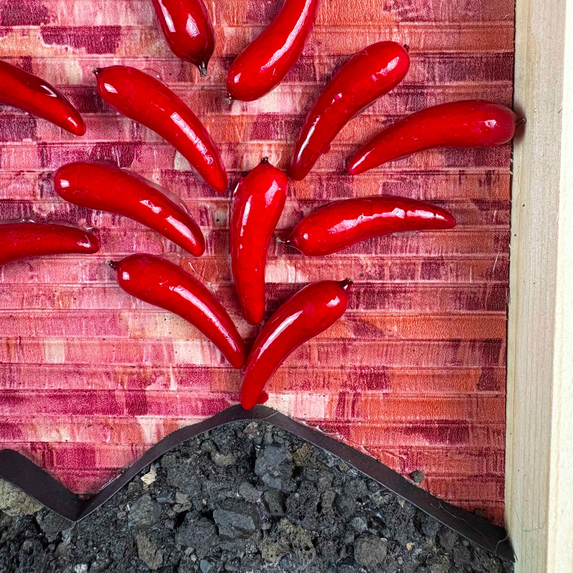 Tutti i lavori Made in Naples, sono realizzati su base di legno di abete utilizzando carte, tessuti e accessori di riciclo. I soggetti rappresentati, sono realizzati con lapillo vulcanico raccolto in terreni limitrofi al Parco Nazionale del Vesuvio. Misure 14x19cm, scatola inclusa.